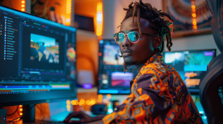 Creative Individual Working on an Animation Project in a Vibrant Home Office With Multiple Screens and Artistic Decor. Generative AI