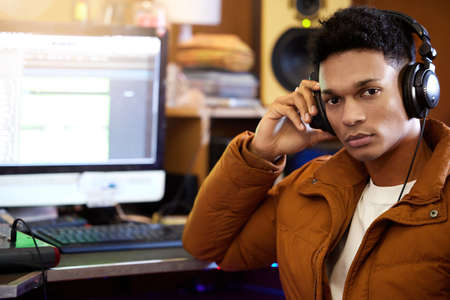 African american male DJ in headphones and cap working in sound recording studio.