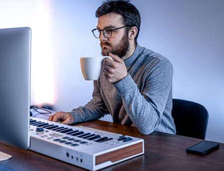 Male musician creates music using computer and keyboard, musician workplace.