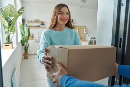 Woman receives a parcel from a postman. Postman is sending a parcel to a woman.