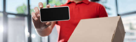 panoramic crop of delivery man holding smartphone with blank screen and carton box