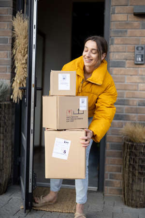 Housewife receiving goods purchased online on the porch of her house, holding cardboard boxes at the entrance door. Concept of contactless food delivery home during a pandemic
