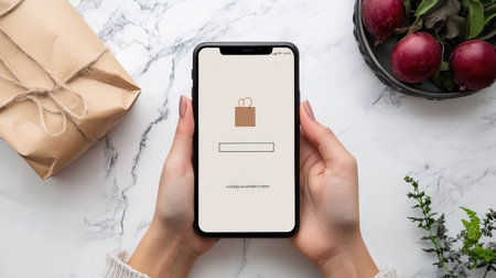 A sleek smartphone is held in hands, showcasing an online shopping app. Nearby are a wrapped gift, red fruits, and a marble surface, creating a stylish shopping scene.
