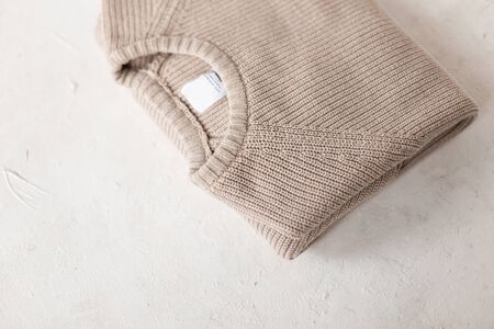 Fashionable casual beige knitted men's sweater on a white background. Stylish knitwear for men. New everyday collection spring-autumn. Close-up.