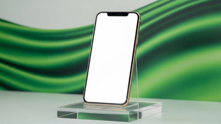 A gold-edged smartphone with a blank white screen is mounted on a transparent stand against a softly blurred green gradient background creating a clean and minimalist composition