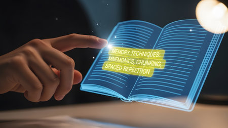 A finger points to a digital book with highlighted text on memory techniques and learning.