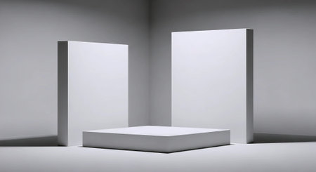 3d render of a white podium in a room with gray walls