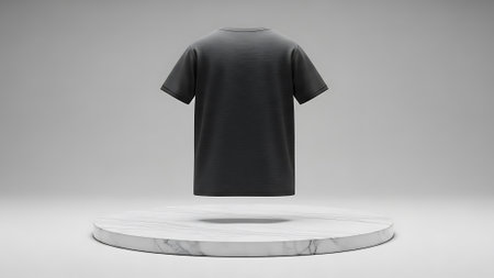 A dark grey t-shirt on a white marble platform against a grey gradient background.