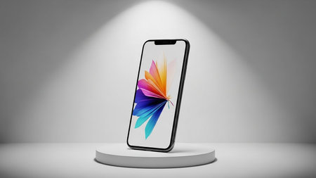 A modern smartphone with a colorful abstract wallpaper is displayed on a white circular pedestal, illuminated by a focused spotlight against a white...