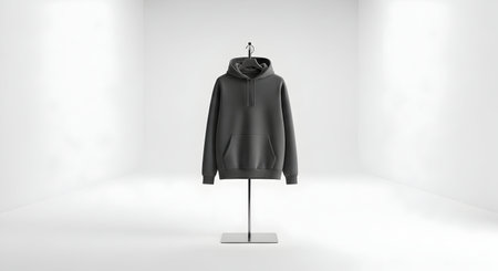 black hooded sweatshirt hanging from a display in front of a neon.