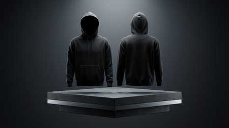 Two enigmatic individuals in dark hoodies stand behind a sleek, illuminated table, their faces obscured by shadows, creating an atmosphere of mystery and intrigue in a dimly lit setting.