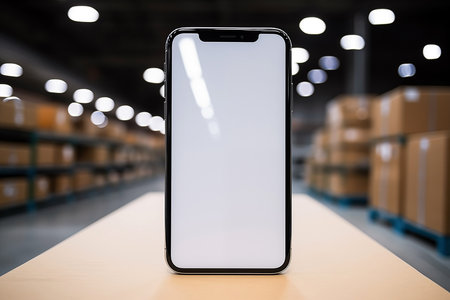 Smartphone with blank screen on warehouse background, digital warehouse accounting concept