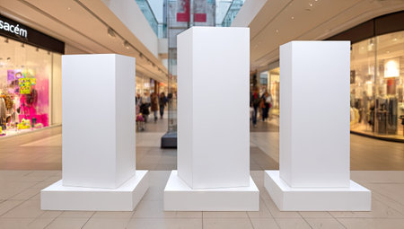 The image showcases three blank white display columns set within a bright commercial interior. The composition features clean lines and a neutral color palette. The columns stand on matching bases, with blurred figures visible in the background suggesting a public space. This setup could be useful for retail or promotional applications.