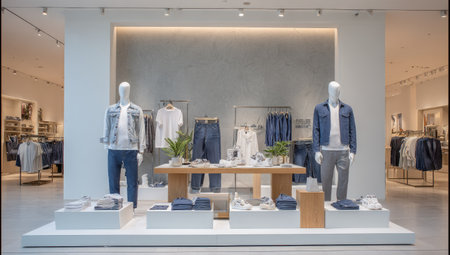 Modern retail clothing display featuring mannequins showcasing various casual outfits, including jeans, shirts, and jackets, neatly arranged on racks and elevated platforms. The space is bright, airy, and well-lit.