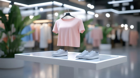 A stylish display featuring a pink t-shirt and sneakers in a contemporary retail environment.
