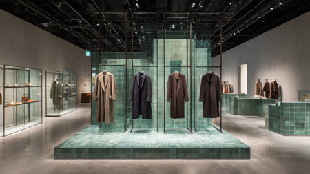 An interior shot showcases a modern clothing store with a focus on elegant display. Coats of various colors hang on a central structure against a backdrop. The scene incorporates clean lines, subdued lighting, and minimalistic design, suggesting a high-end retail environment suitable for fashion or lifestyle content.