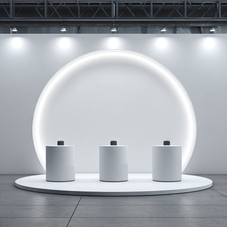 A minimalist stage design features a bright, circular backdrop illuminated from behind, highlighting three cylindrical pedestals. The scene presents a clean, modern aesthetic with neutral colors, emphasizing the objects on display. Suitable for showcasing products or concepts, it can be used for various commercial or editorial applications.
