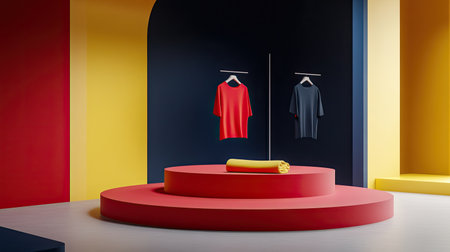 This vibrant interior features minimalist design elements, showcasing colorful clothing on hangers. Perfect for fashion, retail, or artistic presentations in modern spaces.