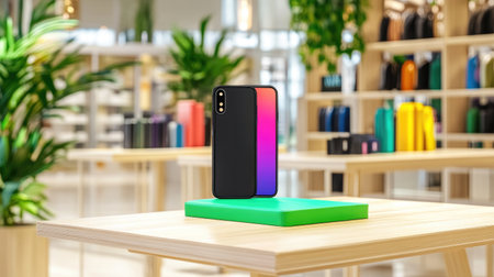 A sleek smartphone stands out on a green platform in a modern retail store, surrounded by colorful mobile accessories and plants, emphasizing contemporary design.