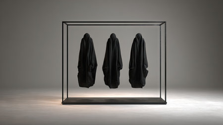 This striking image features three black cloaks displayed in a transparent glass showcase, emphasizing minimalist design and captivating lighting.