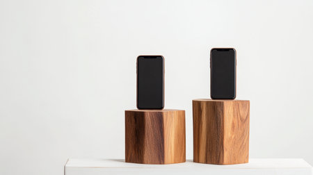 A stunning arrangement featuring two modern smartphones displayed on unique wooden pedestals, showcasing their sleek design and highlighting the beauty of minimalistic aesthetics.