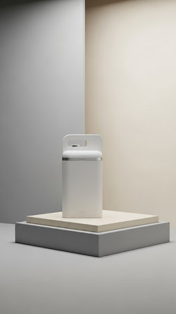 A white modern appliance with a silver band rests on a multi-tiered geometric platform in a minimalist studio with neutral lighting.
