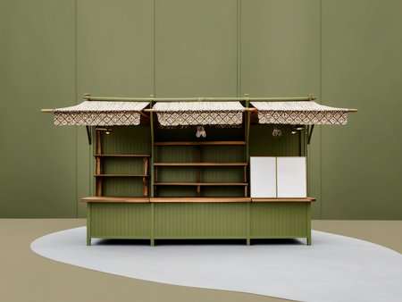 A vibrant bohemian-style market stall painted, set on a flat surface. The stall features eclectic display shelves, colorful sunshades,The background is plain, emphasizing the stall's artistic and free-spirited design.