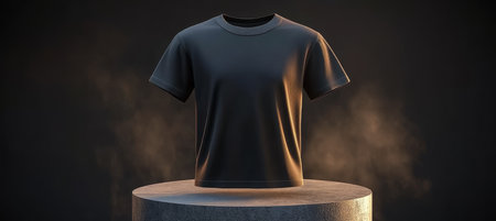 Blank Black T-Shirt on Podium, Minimalist Fashion Presentation with Smoke on Dark Background