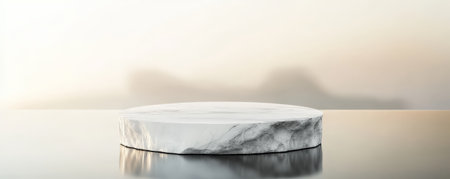 A white marble podium with clean, sharp lines, standing on a reflective surface with a minimalist, soft gradient background in light tones.
