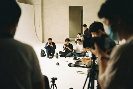 A creative team actively engages in discussions about shot specifics on a film set, emphasizing artistry. Generative AI