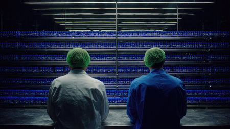 Two individuals, viewed from the back, stand before numerous shelves filled with blue bottles. The scene presents a cool color palette, dominated by blues and greens. Overhead lighting illuminates a sterile indoor environment, suggesting a controlled industrial setting. The image is suitable for various commercial applications, illustrating themes of production or supply.