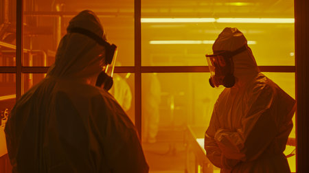 Scientists in protective suits discussing research in a laboratory with orange lighting concept