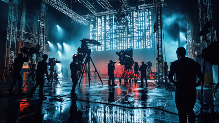 A vibrant studio scene showcasing a team of cinematographers working with state-of-the-art equipment. The dramatic lighting and reflective surfaces create an artistic atmosphere.