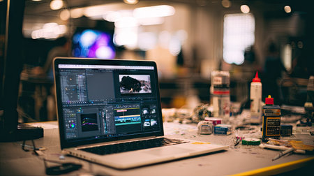 A laptop screen showcases video editing software, situated on a desk cluttered with various objects. The scene exhibits a shallow depth of field, with soft lighting and a bokeh effect. This image could be suitable for illustrating technology, media production, or creative workflows in various commercial contexts.