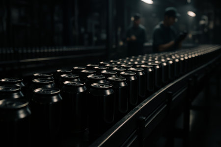 Glossy black aluminum cans moving along a dark metallic conveyor belt in a dimly lit industrial facility. automated production line for beverages or other canned goods, highlighting efficiency and manufacturing process.