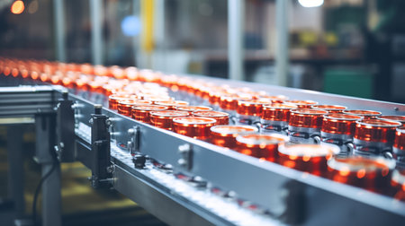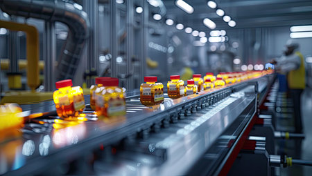 A detailed view of a modern factory floor showcasing the automated processing of yellow liquid in jars, highlighting advanced technology and efficient production methods.