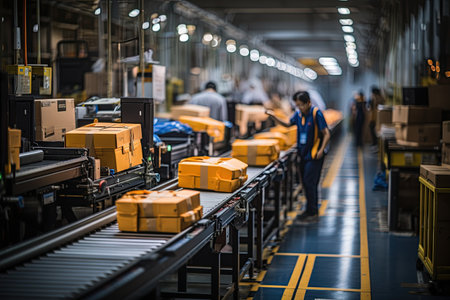Parcels moving on a conveyor belt in a sorting center, logistics and delivery concept. Generative AI