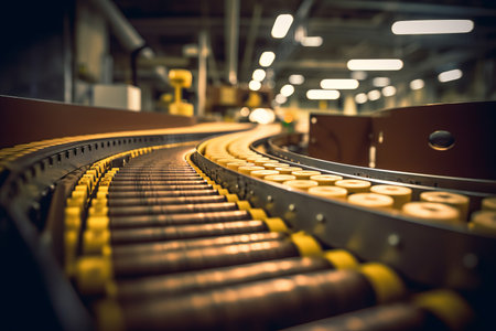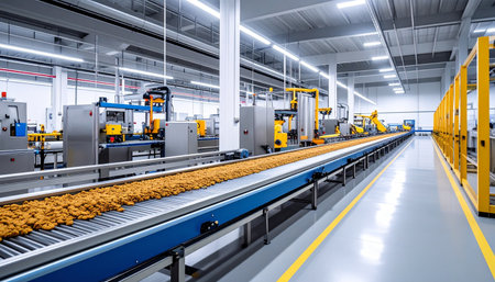 A conveyor system is actively transporting products in an industrial environment. The facility features bright lighting and organized machinery, enhancing workflow and efficiency.