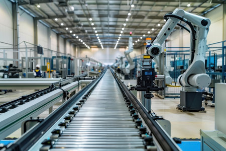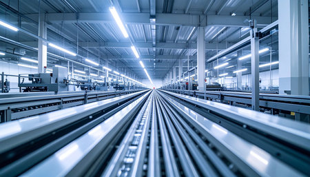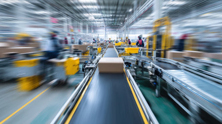 A captivating view of a modern industrial warehouse showcasing machinery and a conveyor belt, emphasizing technology and efficiency in production.