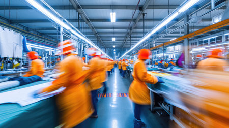 Generative AI, Asian textile sewing factory with many workers, motion blurred photo