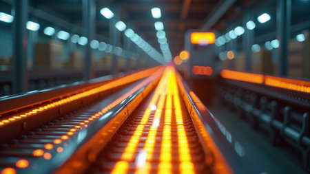 A captivating view of an industrial conveyor belt system in a modern warehouse. This image showcases advanced technology and infrastructure in a dimly lit environment, emphasizing efficiency and automation in the logistics process.