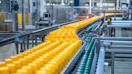 Production line conveying yellow containers through a modern manufacturing facility during daytime