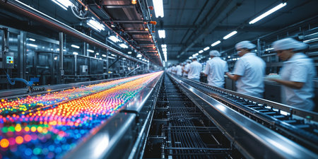Brightly colored production line with workers in white uniforms engaging in quality control tasks