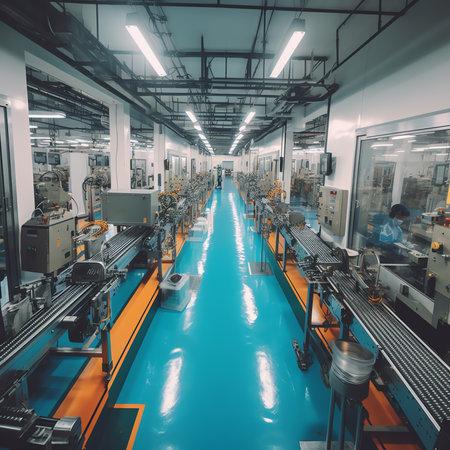 A long, organized assembly line stretches through a modern factory, showing automated machinery, conveyor belts, and workers engaged in production.