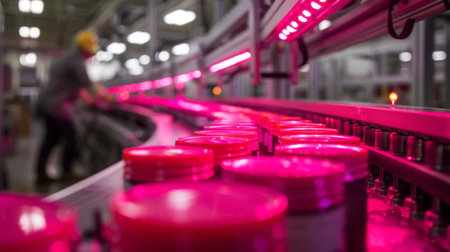 Conveyor Belt Transporting Brightly Colored Containers in a Modern Manufacturing Facility During Evening Hours. Generative AI