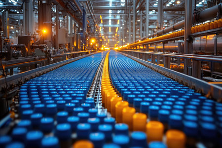 Conveyor Belt Carrying Blue and Yellow Bottles in a Factory