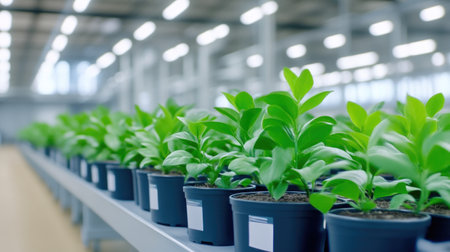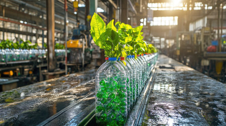 A captivating view of an industrial setting showcasing bottles filled with green plants, symbolizing sustainable innovation and eco-friendly practices in manufacturing.