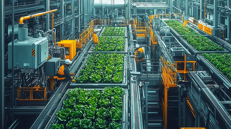 A large indoor farming facility featuring advanced automation technology for producing fresh green vegetables. Workers in protective uniforms oversee the machinery and hydroponic systems in this high-tech agricultural setup.