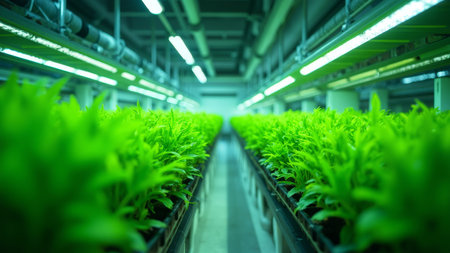 Modern indoor hydroponic farm with vibrant green plants in high-tech environment.