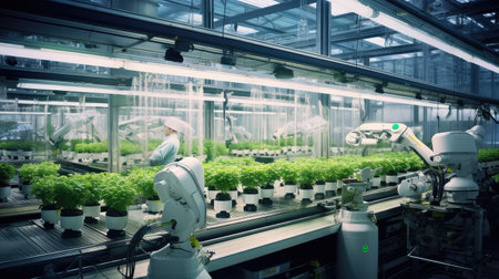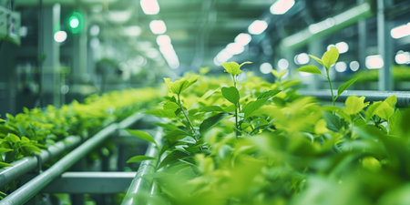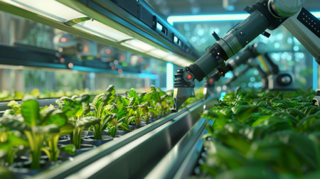 Futuristic food production line with automated technology growing plants.